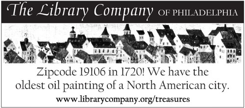 The South East Prospect of the City of Philadelphia is one the Library Company’s treasures; this view of the Delaware Riverfront of Philadelphia is the oldest surviving painting of a North American city. Philadelphia is shown as bustling and mercantile, with a river full of ships. A key at the bottom of the painting numbers and identifies landmarks, including the Court House, the Friends’ Meeting House, and the homes of notable Philadelphians. The arms of William Penn and Pennsylvania appear in the top corners. In the lower left corner, the artist has depicted himself sketching the scene.