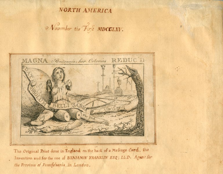 As we enter the final two months of the seemingly endless presidential election season, politics is on nearly everyone’s mind. Political visuals, whether appearing as newspaper cartoons, television commercials, or part of our social media, play a role in shaping the national dialogue about issues facing the electorate. Our 18th-century forbears also recognized the power of visuals in swaying opinion. Commenting in the spring of 1766 on Benjamin Franklin’s cartoon Magna Britannia: Her Colonies Reduc’d illustrated here, Joseph Galloway wrote to Franklin’s son William: “I suspect that the print enclosed by Dr. Franklin to me and several others, is his own. It is certainly a good one, and explains the subject deeply. The lance from the thigh of New England, pointed at the breast of Britannica, is striking, as is indeed every other emblem.”