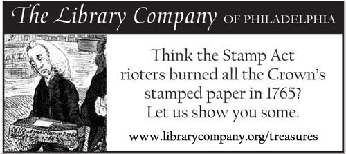The tax stamp pictured here, saved from several boxes burned in protest in New York, forms part of a large collection of material assembled by Du Simitière and purchased by the Library Company at the auction of his estate in 1785. Once a part of his short-lived American Museum, the collection contains numerous pieces of ephemera