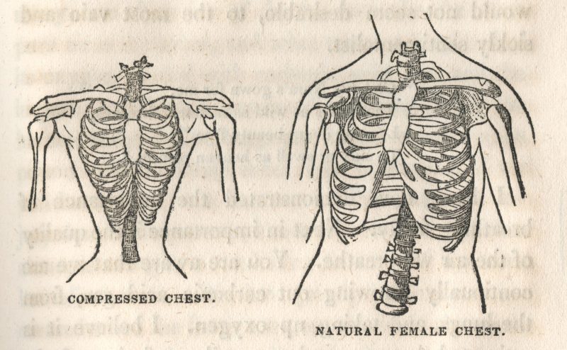 Mary Gove Nichols’s Lectures to Ladies is a compilation of her lectures to women on their bodies and health. A health and marriage reformer, Mary wanted women to learn more about their own anatomy, so they would be able to have more control over their bodies. Mary herself was plagued with consumption her whole life. Her sister died of consumption at the age of twenty-one, which Mary argued was exacerbated by wearing a tight-laced corset and exposure to harsh weather. In her lectures, she warned women of corsets and highlighted the effects of popular fashion on the body.