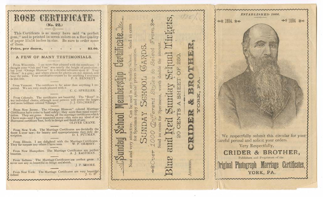 Crider circular/caption: Crider & Brother, Publishers and Proprietors of the Original Photograph Marriage Certificates, York, Pa. (York, Pa., 1884). Gift of David Doret.