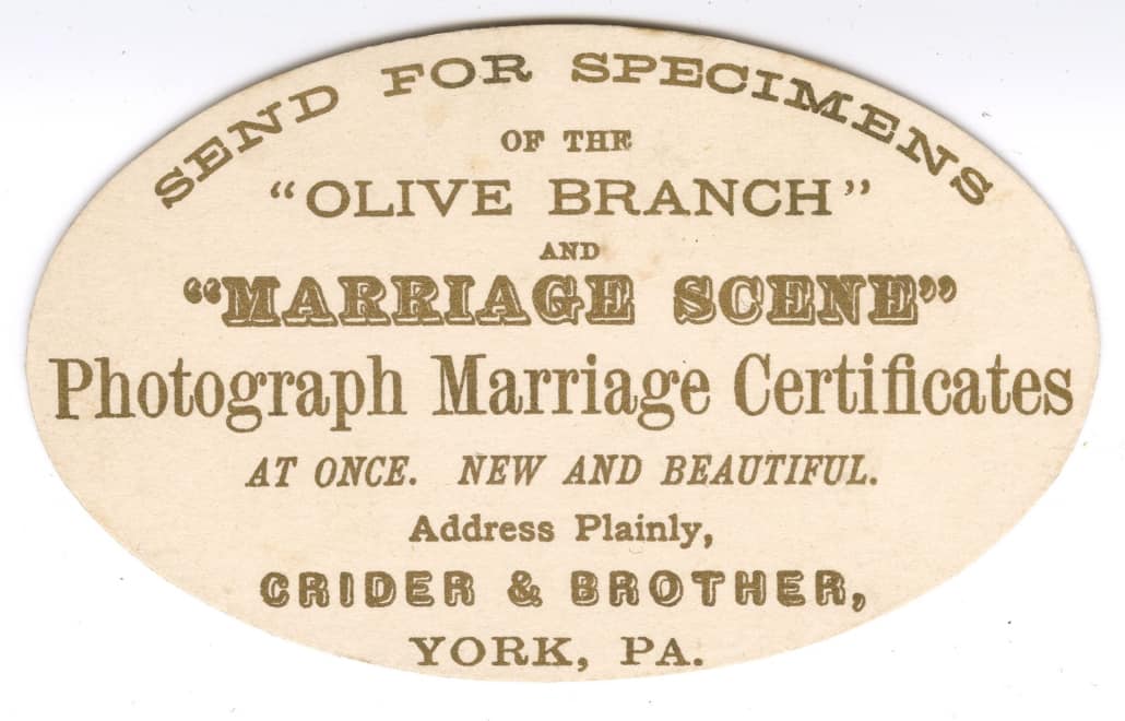 For many, the month of June means the start of the wedding season.  More recently, the wedding season has also become synonymous with the wedding industry.  However, the commercialization of weddings is not new. This recently acquired circa 1880 advertisement for “marriage scene” certificates issued by York, PA publisher Crider & Brother shows that certain Victorian businesses had already started to capitalize on memorializing the big day. It complements a similar Crider advertisement we hold for the publisher’s “orange blossom” and “rose” photograph marriage certificates. Given their oval shape, the cards were possibly used as inserts in spaces for photographs on Crider certificate specimens.