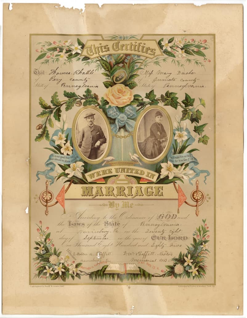 “marriage scene” marriage certificate/caption: Crider & Brother marriage scene-style photograph marriage certificate (York, Pa.: Crider & Brother, 1877). Completed in manuscript in 1879. Color lithograph