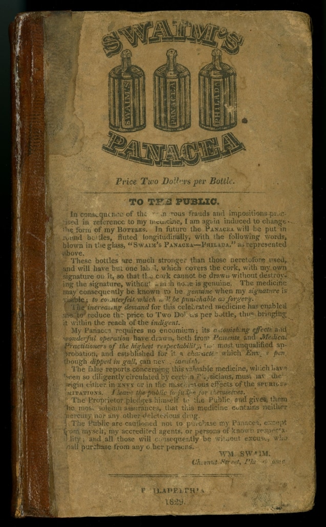 Cover and Frontis of: Swaim, Wm. (William). Cases of cures performed by the use of Swaim’s panacea. Philadelphia : [s.n.], 1829.