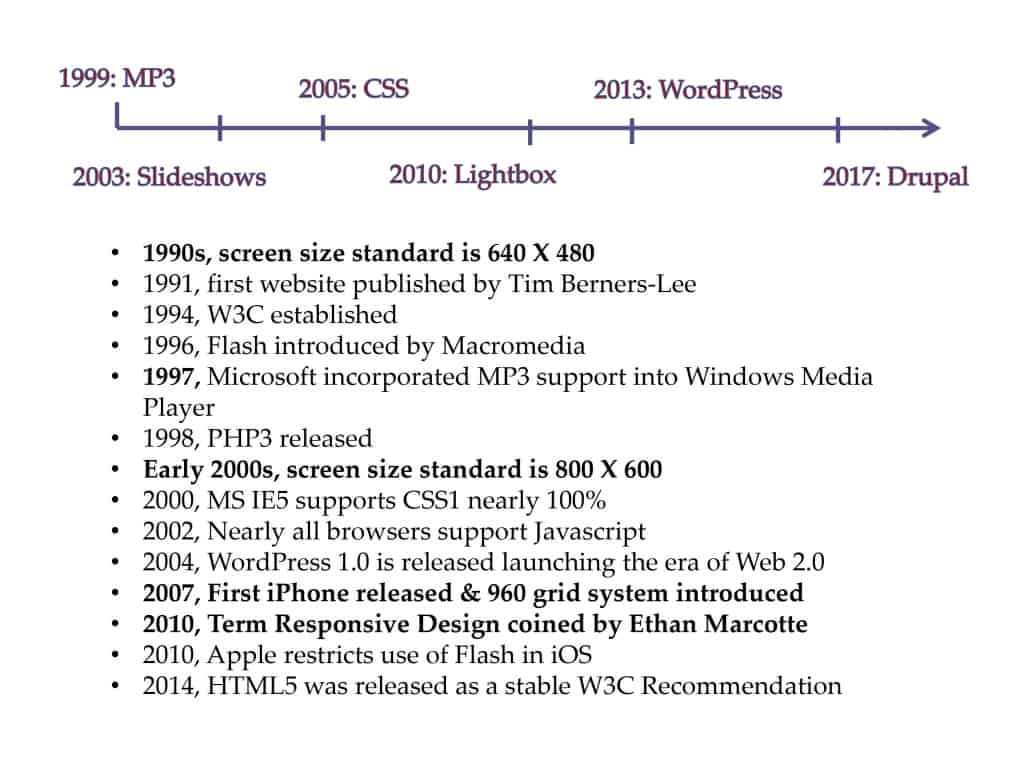 Flash forward to early 1998, I shared this design experience with my supervisor and asked if I could purchase a beginner’s guide to HTML and learn how to manage the website. Within a year, I had redesigned the organizational site and began designing our first online exhibition Ardent Spirits. This began a long journey of self-education through books and trial and error combined with a few classes as they became available. By 2009 I had built a portfolio of twenty-seven online exhibitions. In 2010 I was given the opportunity to attend Moore College of Art & Design and earn the Digital Arts for Print & Web Certificate. This was a perfect time to receive formal training in website design as the 960 grid system was finally established as a design methodology, the concept of responsive design was emerging, and user experience design through the use of personas was trending.