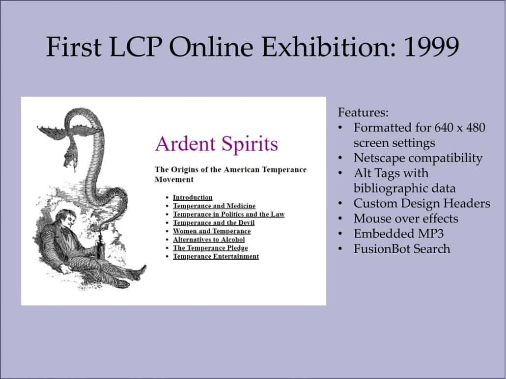 Over the course of twenty years, the Library Company of Philadelphia published nearly sixty online exhibitions, its first being Ardent Spirits in 1999. What started as simply a way to share a short-lived gallery exhibition more broadly later evolved into a key marketing piece of the exhibition lifecycle. Today, online exhibitions are brought into the fold of all that is digital in the library. An ecosystem of digital life has emerged with most collection items featured in an online exhibition being linked to subject guides, blog posts, social media, and the digital asset repository.