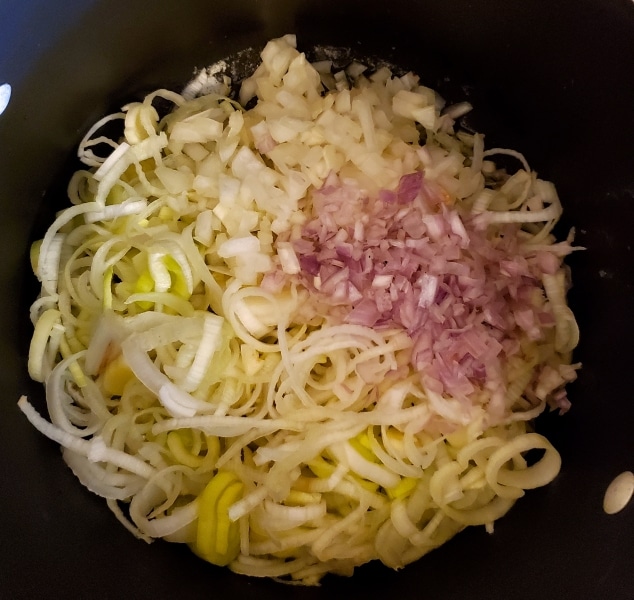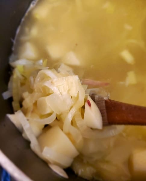Put the butter, leeks, and onion in the soup pot and on the fire.