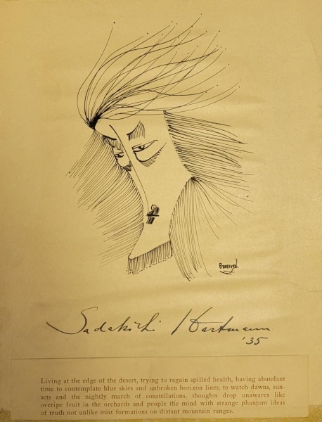 Sadakichi Hartmann endured hardships particularly in the final chapter of his life. My Crucifixion: Asthma for 40 Years details his long affliction with a chronic ailment, mentioned in his earlier letter. It takes on increased sympathies in our time of COVID-19. His childhood asthma became exacerbated after he was stricken with the Spanish flu in 1918.”[17] He detailed the real physical pain and the consequences it had on his ability to be active. He suffered a severe injury in a head-on car collision, putting him in the hospital for two months in 1936. He always struggled to earn a living as a writer and artist. He contended with racism his whole life. He became a naturalized American citizen in 1894. Despite his citizenship, during the Second World War he faced harassment and accusations because of his heritage. In 1942, the United States government forcibly imprisoned people of Japanese descent into internment camps. Sadakichi Hartmann and his family were regularly visited and questioned by the F.B.I. Approximately two-thirds of the 120,000 internees were likewise American citizens. Likely due to his age and severely poor health, Sadakichi managed to escape being sent to the camps. Nonetheless, he was investigated and needed to defend his Americanness and that he was not a spy. He died in 1944 while visiting his daughter in Florida before the war ended.