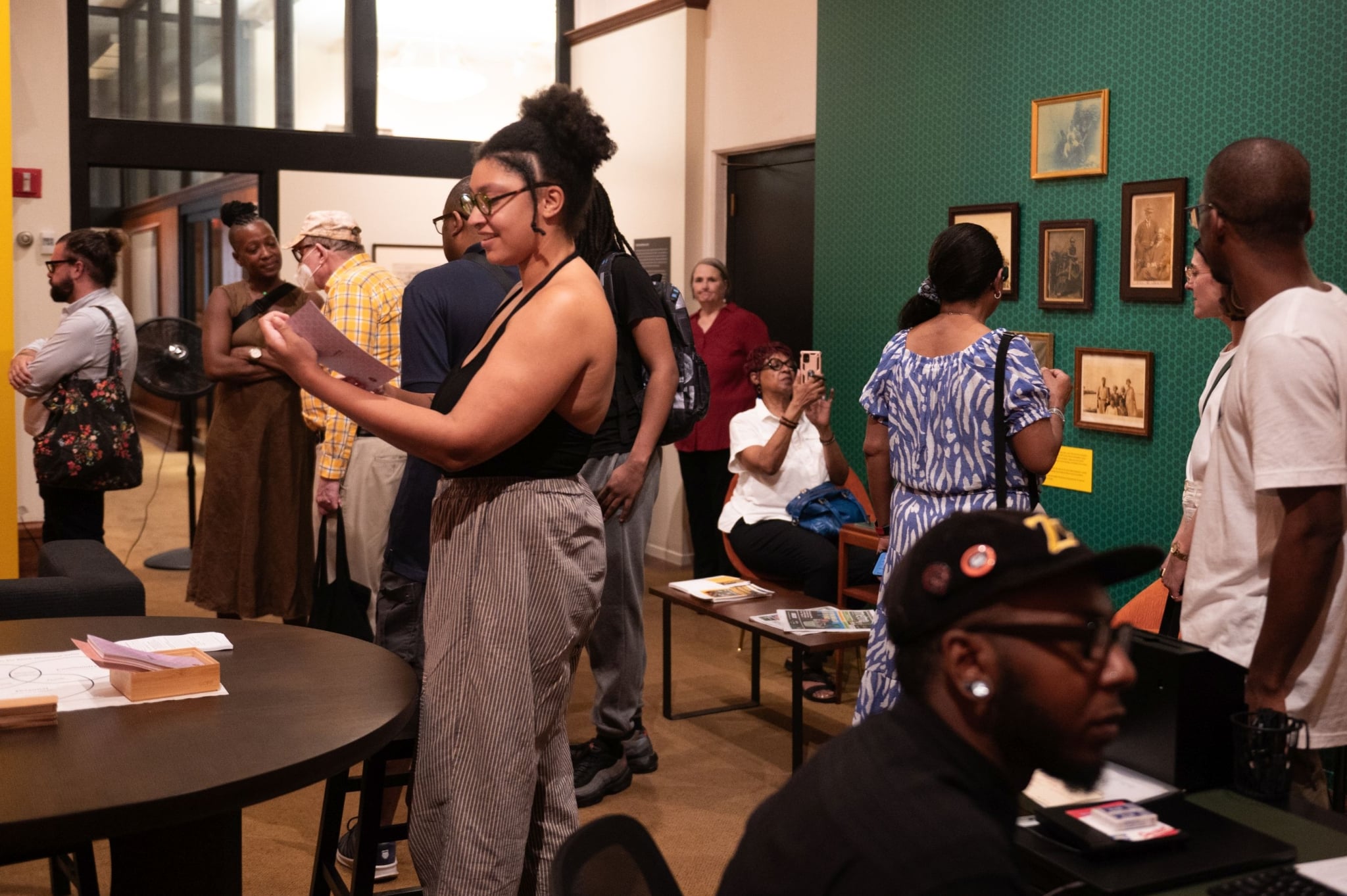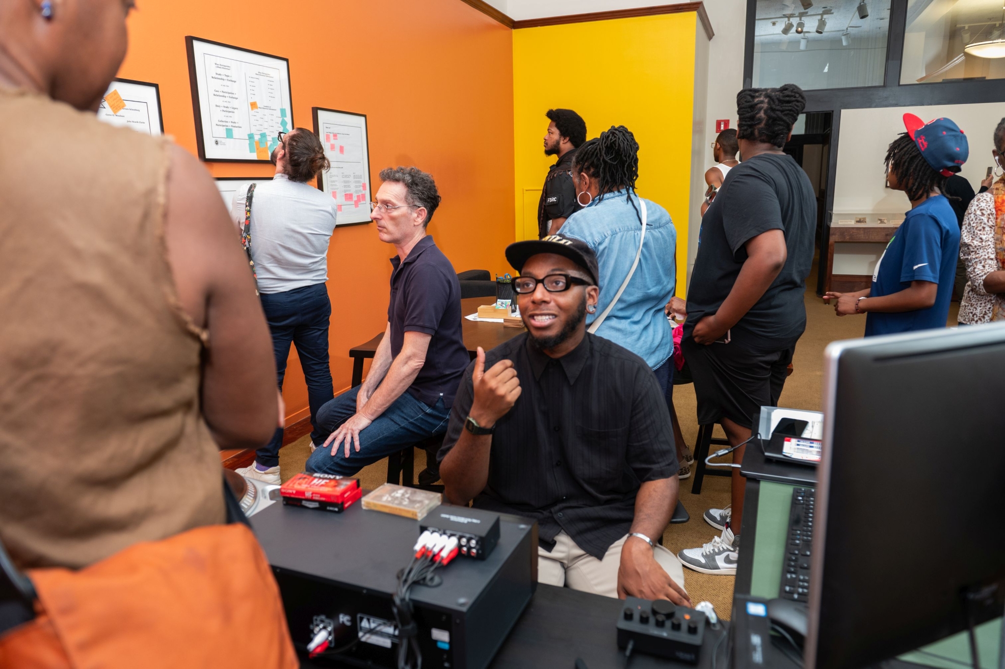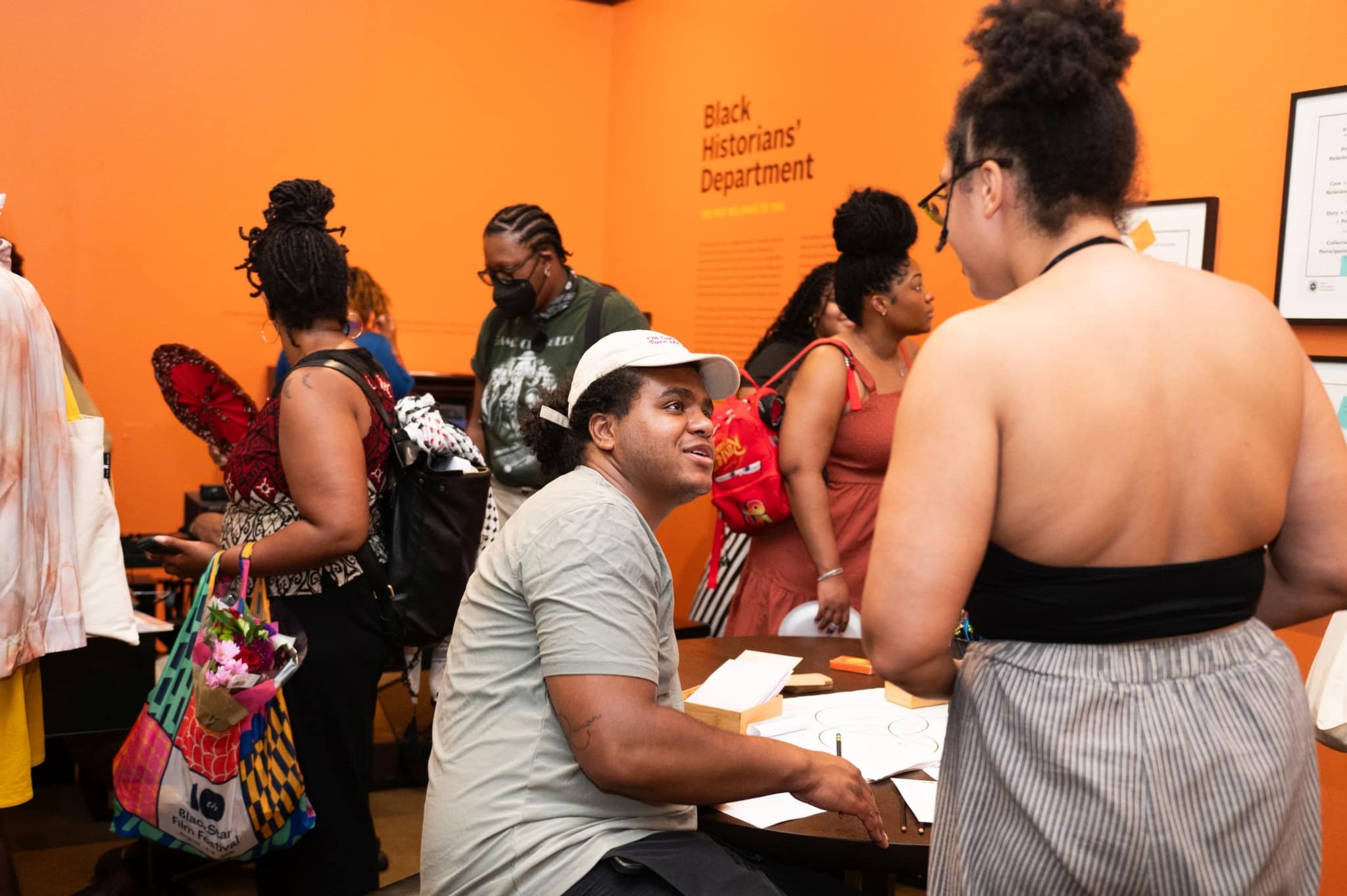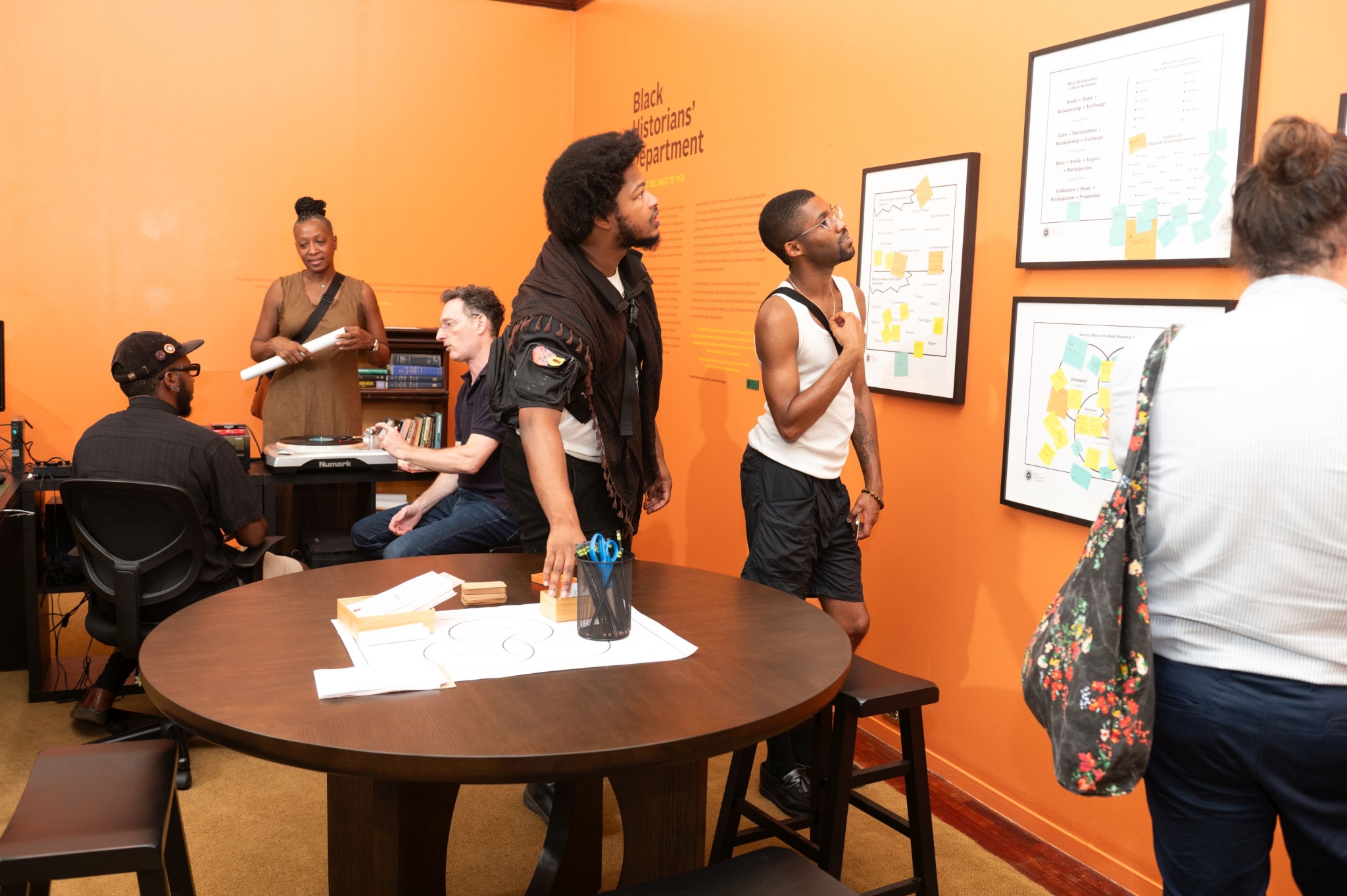 In The Black Historians’ Department: The Past Belongs to You, speculative historian Tafari Robertson created a space dedicated to the Black historians who cultivate their practice and stories outside of traditional institutions. It was a speculation of what would be different about history as a form if it were built around the ways that Black people hold and exchange information with each other and what it means to amplify and support those processes. Tafari explored these ideas with other members of Philadelphia’s Black artistic and cultural community in a series of workshops/listening sessions. The exhibition that grew out of these sessions included an office setting and a living room interior setting where visitors were invited to engage with reference books, audio tapes, and video clips as ways to experience history. Two cases of items from the Library Company’s African American History Collection were also displayed. The Past Belongs to You was an invitation to understand Black history as a community practice, not to be discovered or authorized, but participated in.