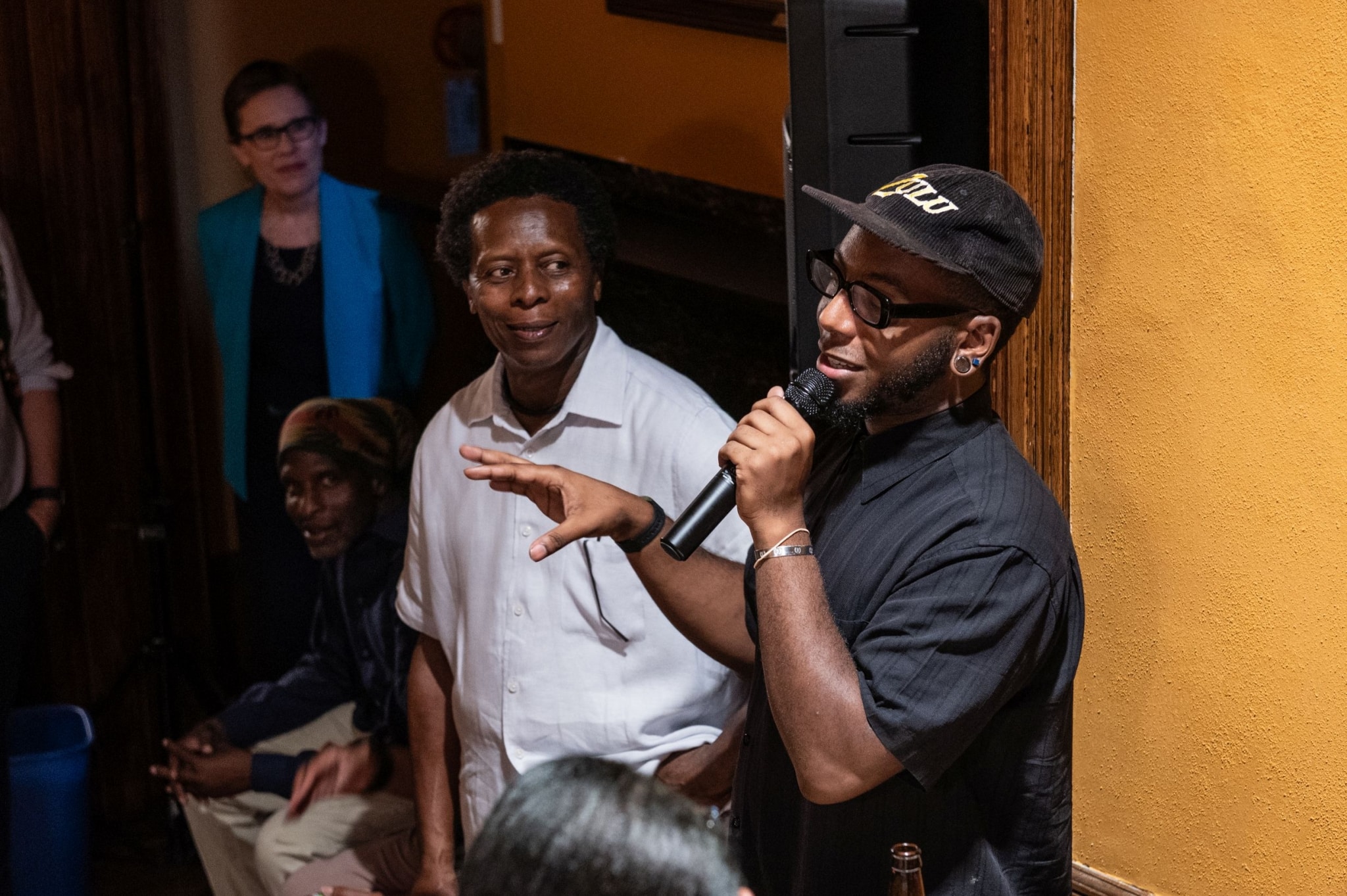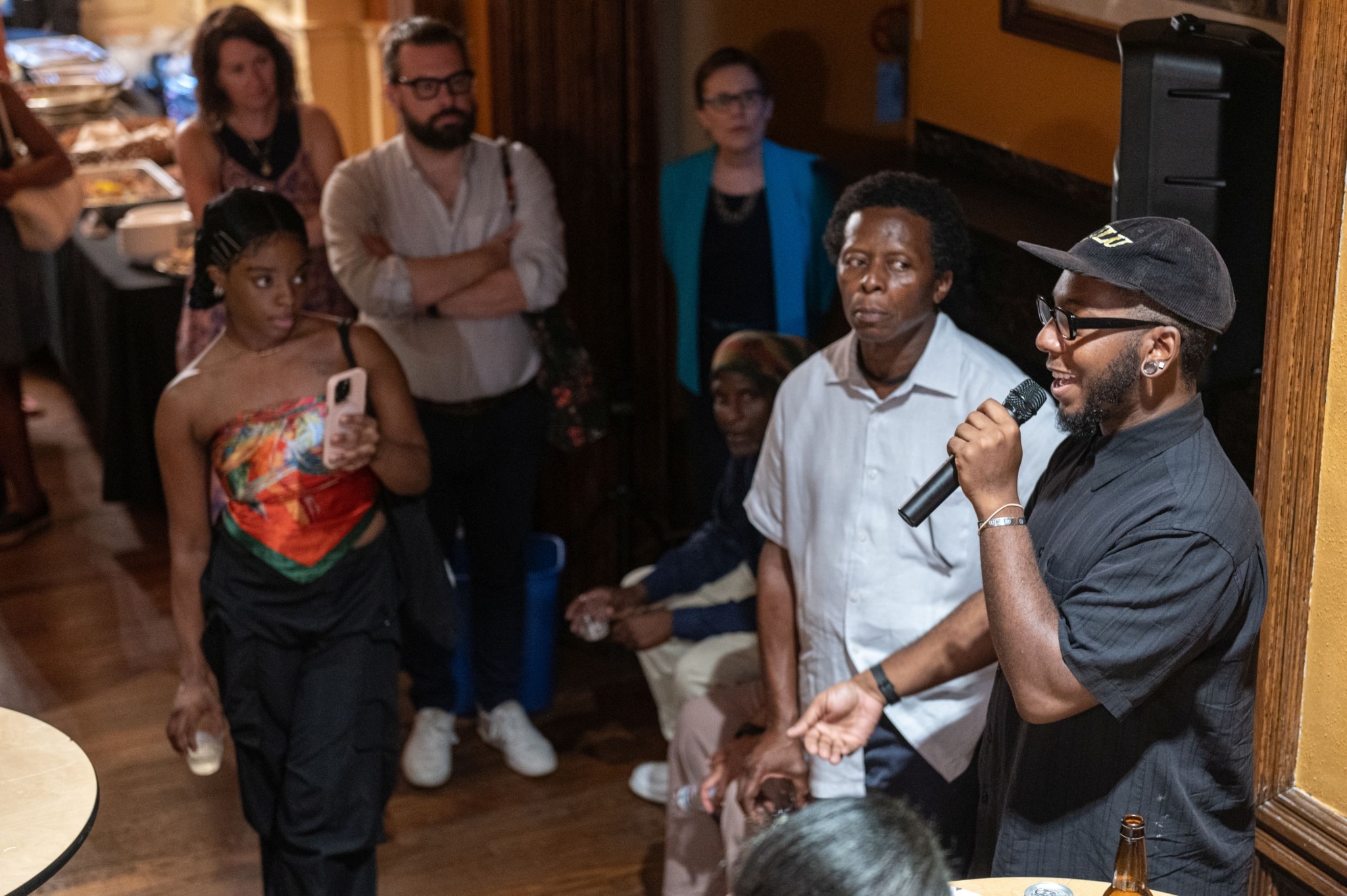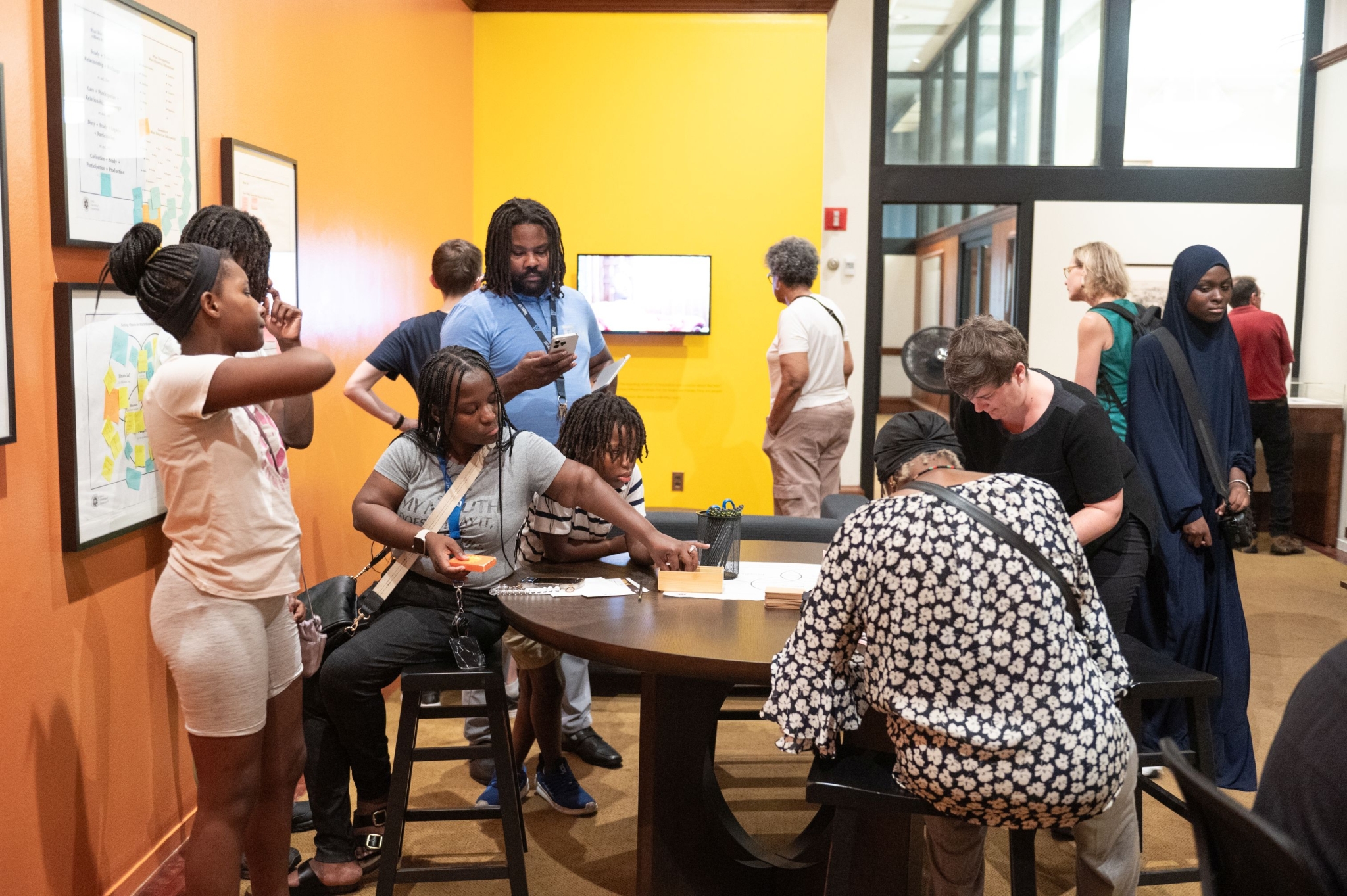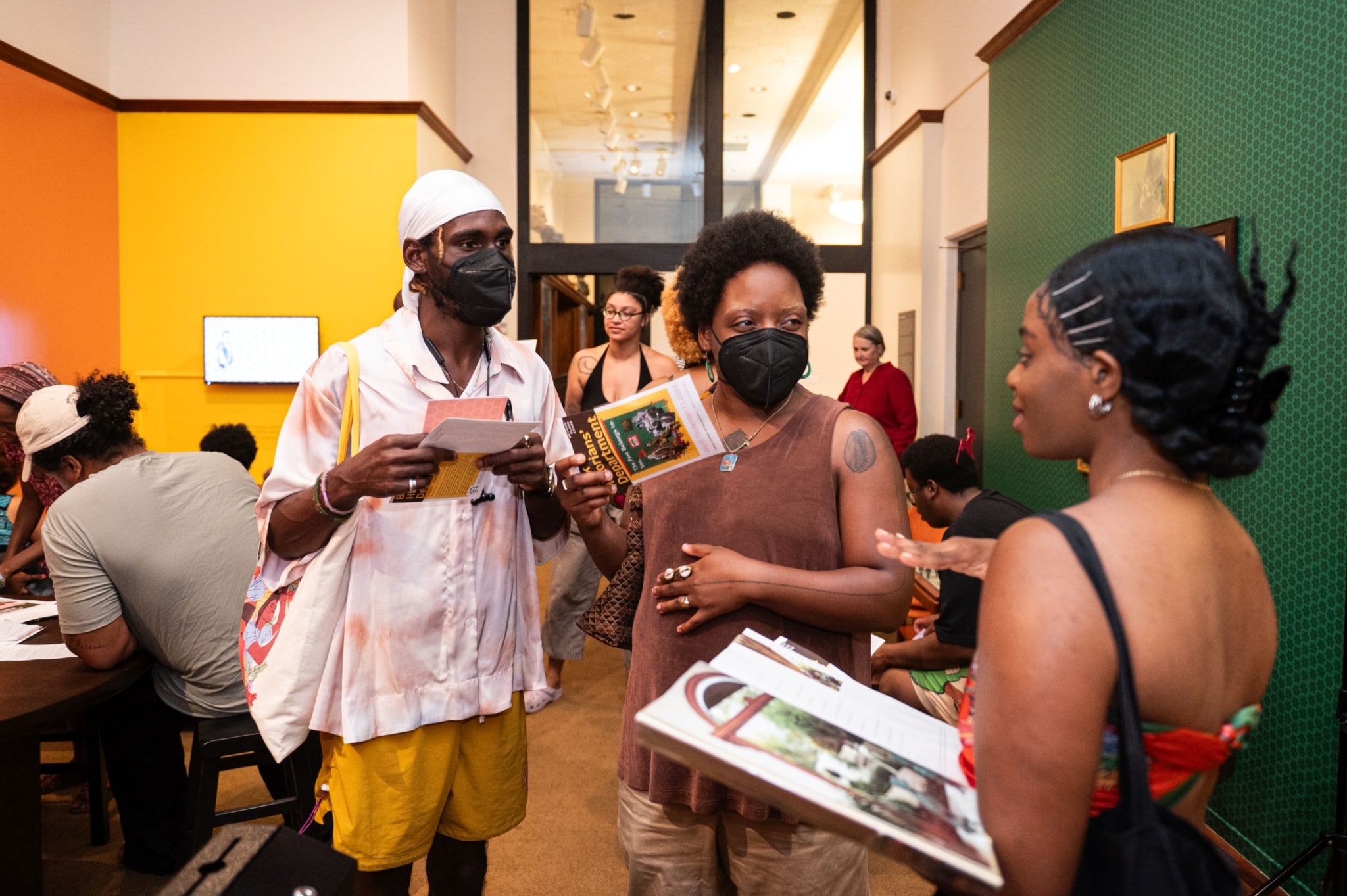 In The Black Historians’ Department: The Past Belongs to You, speculative historian Tafari Robertson created a space dedicated to the Black historians who cultivate their practice and stories outside of traditional institutions. It was a speculation of what would be different about history as a form if it were built around the ways that Black people hold and exchange information with each other and what it means to amplify and support those processes. Tafari explored these ideas with other members of Philadelphia’s Black artistic and cultural community in a series of workshops/listening sessions. The exhibition that grew out of these sessions included an office setting and a living room interior setting where visitors were invited to engage with reference books, audio tapes, and video clips as ways to experience history. Two cases of items from the Library Company’s African American History Collection were also displayed. The Past Belongs to You was an invitation to understand Black history as a community practice, not to be discovered or authorized, but participated in.