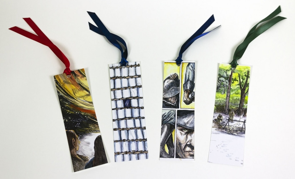 Assorted 2 x 7-inch color bookmarks with ribbons. Printed by Philadelphia-based Fireball Printing. Featuring the following prints from Ghost River: The Fall and Rise of the Conestoga (Red Planet Books and Comics): (left to right in image) Prayer; Wampum Belt; Arming of Philadelphia; and Conestoga Indiantown.