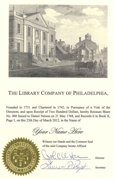 For nearly 300 years, shareholders have served as the backbone of the Library Company of Philadelphia. Shares have been held by signers of the Declaration and the Constitution, merchants, doctors, soldiers, artists, teachers, philanthropists, politicians, and much more. From 1731 to today, shareholders have provided crucial financial support year for the Library Company’s mission, and helped shape the Library Company into the premier learning community it is today.